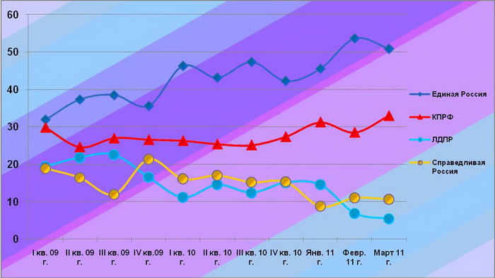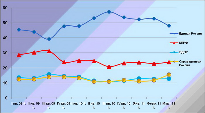 Март 2011 года ознаменовался падением информационных индексов «Единой России» с 52,8 в предыдущем месяце до 48%, что в среднем за I квартал 2011 года принесло ей 50,4%. Освободившееся пространство информационного поля было распределено между остальными парламентскими партиями, продемонстрировавшими небольшой рост показателей: «Справедливая Россия» на 3,6% (с 11,8 до 15,4%) и первоквартальные 12,1%, КПРФ на 1% (с 22,8 до 23,8%) и 23,5% по итогам января – марта, ЛДПР – на 0,2% (с 12,6 до 12,8%) и средние 14% за первые три месяца текущего года.