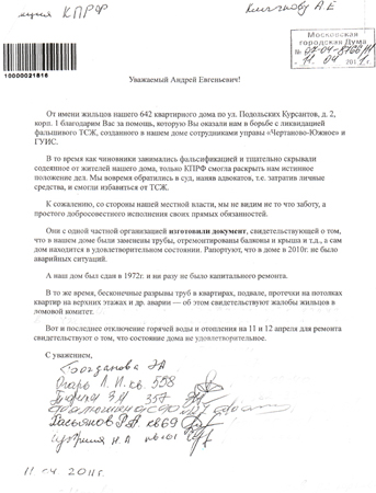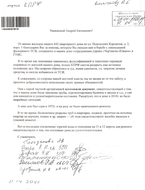 Москвичи благодарят фракцию КПРФ в Мосгордуме за помощь в борьбе с фальшивым товариществом собственников жилья.