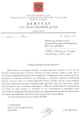 9 марта 2011 года на заседании Государственной Думы РФ, говоря об уровне эффективности депутатской переписки, С.И. Штогрин, предварительно не проверив информацию, ошибочно отметил, что не получил ответа на свой запрос, направленный в Министерство регионального развития В.Ф. Басарагину по вопросу финансирования и объема выполненных работ на строительстве Тунгусского водозабора.