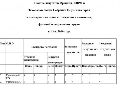 Участие депутатов Фракции КПРФ в Законодательном Собрании Пермского края в пленарных заседаниях, заседаниях комитетов, фракций и депутатских групп в 1 кв. 2010 года