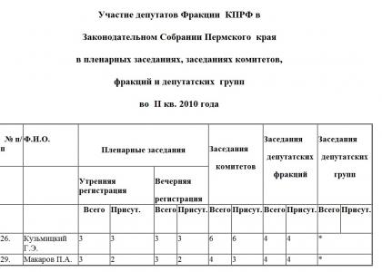 Участие депутатов Фракции КПРФ в Законодательном Собрании Пермского края в пленарных заседаниях, заседаниях комитетов, фракций и депутатских групп во II кв. 2010 года