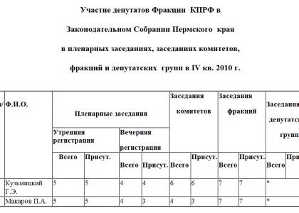 Участие депутатов Фракции КПРФ в Законодательном Собрании Пермского края в пленарных заседаниях, заседаниях комитетов, фракций и депутатских групп в IV кв. 2010 г.