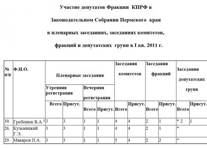 Участие депутатов Фракции КПРФ в Законодательном Собрании Пермского края в пленарных заседаниях, заседаниях комитетов, фракций и депутатских групп в I кв. 2011 г.