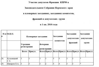 Участие депутатов Фракции КПРФ в Законодательном Собрании Пермского края в пленарных заседаниях, заседаниях комитетов, фракций и депутатских групп в 1 кв. 2010 года