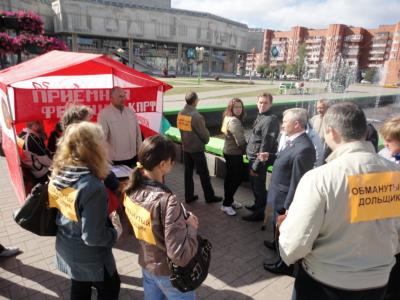 В 9 часов в приемную на площади обратилась группа обманутых дольщиков жилищного строительства в Ярославской области. Более 15 человек, объявивших голодовку в связи с нерешением властью их проблем пришли за поддержкой к депутатам-коммунистам.