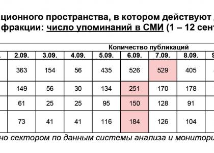 В период с 1 по 12 сентября в среднем медиа-пространство было распределено между фракциями парламентских партий в соотношении: 48% - у «Единой России», 24,1% - у КПРФ, 12,5% - у ЛДПР и 15,4% - у «Справедливой России».