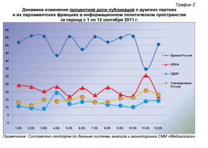 Проведённый анализ позволяет заключить, что за период с 1 по 12 сентября 2011 г. количественный аспект присутствия парламентских партий в информационном пространстве кардинальных изменений не претерпел: по-прежнему в большей части всех новостных сводок фигурирует «Единая Россия», оппозиционные же партии оттесняются на второй план, знаковые события из их жизни всячески замалчиваются.