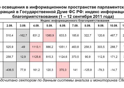 Характер освещения в информационном пространстве парламентских партий и их фракций в Государственной Думе ФС РФ: индекс информационного благоприятствования (1 – 12 сентября 2011 года)