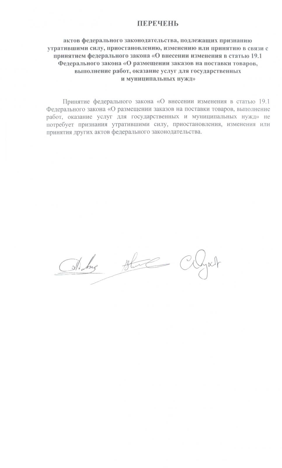 На основании части 1 статьи 104 Конституции Российской Федерации вносим на рассмотрение Государственной Думы Федерального Собрания Российской Федерации в качестве законодательной инициативы проект федерального закона «О внесении изменения в статью 19.1 Федерального закона «О размещении заказов на поставки товаров, выполнение работ, оказание услуг для государственных и муниципальных нужд».