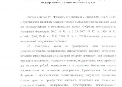 «5. Размещение заказа на приобретение (или техническое усовершенствование, модернизацию, переустройство) легкового автомобиля, начальная (максимальная) цена единицы которого превышает (или превысит в результате технического усовершенствования, модернизации, переустройства) два миллиона рублей, осуществляется получателями бюджетных средств исключительно на основании распоряжения Правительства Российской Федерации о предоставлении соответствующему получателю бюджетных средств права на приобретение легкового автомобиля или техническое усовершенствование, модернизацию, переустройство принадлежащего получателю бюджетных средств конкретного автомобиля, с указанием максимальной цены за автомобиль.