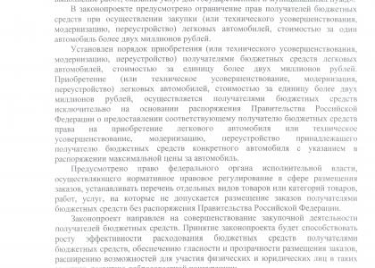 В законопроекте предусмотрено ограничение прав получателей бюджетных средств при осуществлении закупки (или технического усовершенствования, модернизацию, переустройство) легковых автомобилей, стоимостью за один автомобиль более двух миллионов рублей.