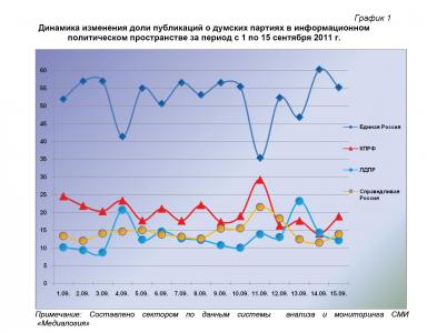Динамический ряд, отражающий порядок наполнения медиа-потока публикациями о деятельности парламентских партий за период с 1 по 15 сентября 2011 г. (график 1), позволяет заключить, что 15 сентября показатели парламентских политических сил достигли средних для них значений.