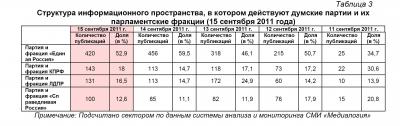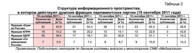 Контент-анализ публикаций СМИ с помощью системы «Медиалогия» позволил выявить следующую структуру информационного пространства, в котором действуют думские политические партии (таблица 1).