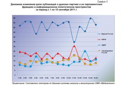 15 сентября 2011 г. в информационном пространстве отмечалось 368 публикаций о партии «Единая Россия» или 55,2% от общего числа высказываний, озвученных в адрес парламентских партий. В 125 материалах (18,8%) фигурировала КПРФ, в 93 (13,9%) - «Справедливая Россия», а в 81 (12,1%) – ЛДПР.