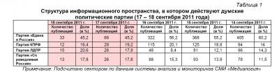 Контент-анализ публикаций СМИ с помощью системы «Медиалогия» позволил выявить следующую структуру информационного пространства, в котором действуют думские политические партии (таблица 1).