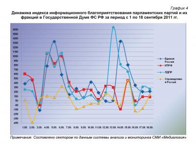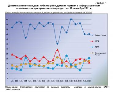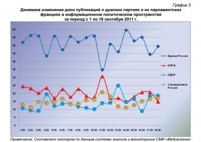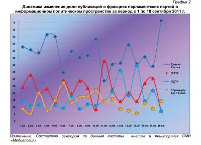 Анализ динамики доли публикаций о фракциях парламентских партий за 1 – 18 сентября 2011 года (график 2) позволяет заключить, что на 18 сентября пришёлся максимальный за рассматриваемый период процент упоминаний думских единороссов и минимальный – коммунистов и либерал-демократов. Показатели 17 сентября приближались к средним значениям.