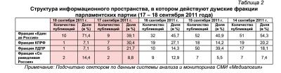 Контент-анализ публикаций СМИ позволил выявить также структуру информационного пространства, в котором действуют думские фракции парламентских партий (таблица 2).