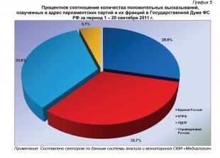 20 сентября 2011 г. в информационном пространстве отмечалось 336 публикаций о партии «Единая Россия» или 47,8% от общего числа высказываний, озвученных в адрес парламентских партий. В 140 материалах (19,9%) фигурировала КПРФ, в 138 (19,6%) – «Справедливая Россия», а в 89 (12,7%) – ЛДПР.