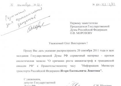Прошу Вас дать указание распространить 20 сентября 2011 года в зале заседания Государственной Думы РФ справочный материал - краткая аналитическая записка "О причинах роста авиакатастроф в гражданской авиации РФ" к Правительственному часу "Информация Министра транспорта Российской Федерации Игоря Евгеньевича Левитина".