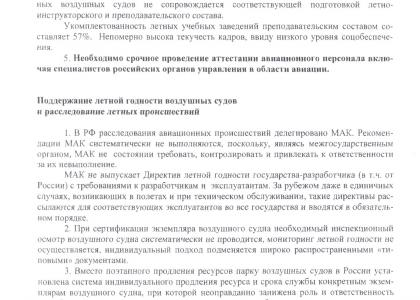4. Состояние с обучением и переподготовкой летного состава является катастрофическим. В летных учебных заведениях используются морально устаревшие воздушные суда, исключительно низок налет при выпуске летчиков. Приобретение иностранных учебных воздушных судов не сопровождается соответствующей подготовкой летно-инструкторского и преподавательского состава.