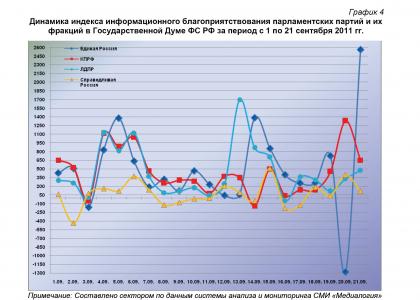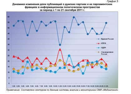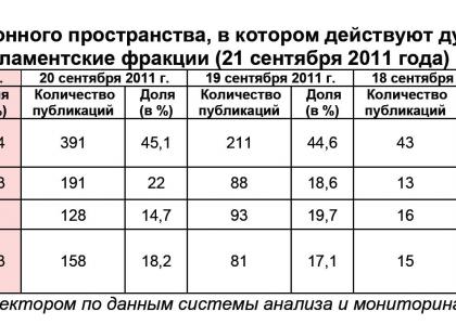 21 сентября 2011 г. в информационном пространстве отмечалось 494 публикации о партии «Единая Россия» или 56,1% от общего числа высказываний, озвученных в адрес парламентских партий. В 151 материале (17,1%) фигурировала КПРФ, в 133 (15,1%) – «Справедливая Россия», а в 103 (11,7%) – ЛДПР.