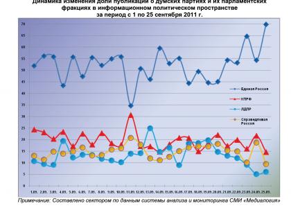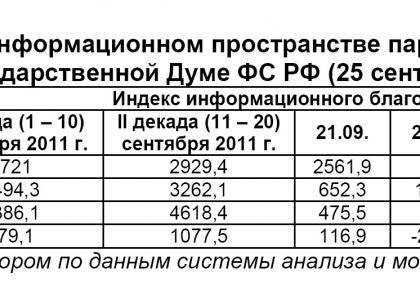 25 сентября 2011 г. в информационном пространстве отмечалось 192 публикации о партии «Единая Россия» или 72,7% от общего числа высказываний, озвученных в адрес парламентских партий. В 37 материалах (14%) фигурировала КПРФ, в 21 (8%) – «Справедливая Россия», а в 14 (5,3%) – ЛДПР.