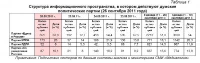 Контент-анализ публикаций СМИ с помощью системы «Медиалогия» позволил выявить следующую структуру информационного пространства, в котором действуют думские политические партии (таблица 1).