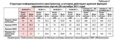 Контент-анализ публикаций СМИ позволил выявить также структуру информационного пространства, в котором действуют думские фракции парламентских партий (таблица 2).