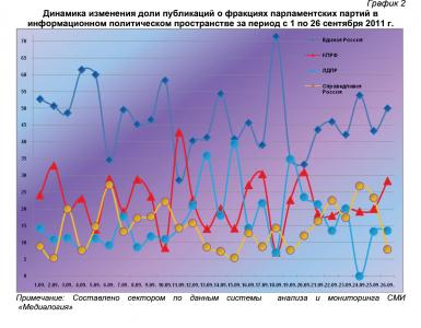 Анализ динамики доли публикаций о фракциях парламентских партий за 1 – 26 сентября 2011 года (график 2) позволяет заключить, что 26 сентября процент упоминаний думских коммунистов был близок к сентябрьскому максимуму, а эсеров – стремился к минимуму. Фракционный же индекс «Единой России» был немногим выше, а ЛДПР – чуть ниже среднемесячного значения.