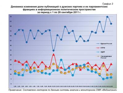 26 сентября 2011 г. в информационном пространстве отмечалось 551 публикации о партии «Единая Россия» или 63,9% от общего числа высказываний, озвученных в адрес парламентских партий. В 173 материалах (20%) фигурировала КПРФ, в 87 (10,1%) – «Справедливая Россия», а в 52 (6%) – ЛДПР.