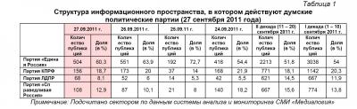 Контент-анализ публикаций СМИ с помощью системы «Медиалогия» позволил выявить следующую структуру информационного пространства, в котором действуют думские политические партии (таблица 1).