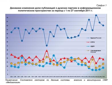Динамический ряд, отражающий порядок наполнения медиа-потока публикациями о деятельности парламентских партий за период с 1 по 27 сентября 2011 г. (график 1), позволяет заключить, что 27 сентября показатели рассматриваемых политических сил были достаточно близки к их среднемесячным значениям (с небольшим завышением индекса «Единой России» и занижением – иных парламентских партий).