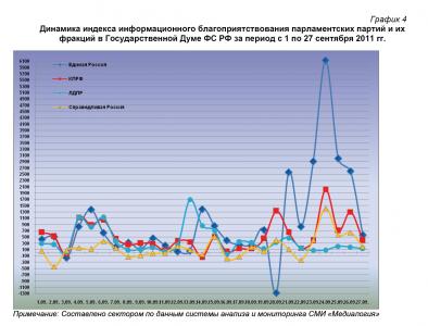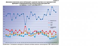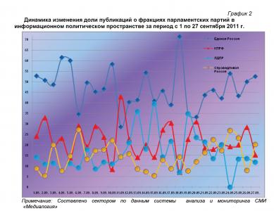 Анализ динамики доли публикаций о фракциях парламентских партий за 1 – 27 сентября 2011 года (график 2) позволяет заключить, что 27 сентября процент упоминаний думских эсеров был близок к сентябрьскому максимуму, а коммунистов и либерал-демократов – стремился к минимуму. Фракционный же индекс «Единой России» остался немногим выше среднемесячного значения.