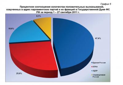 27 сентября 2011 г. в информационном пространстве отмечалось 504 публикации о партии «Единая Россия» или 60,3% от общего числа высказываний, озвученных в адрес парламентских партий. В 156 материалах (18,7%) фигурировала КПРФ, в 108 (12,9%) – «Справедливая Россия», а в 68 (8,1%) – ЛДПР.