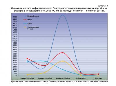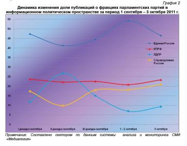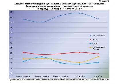 Анализ динамики доли публикаций о фракциях парламентских партий за 1 сентября – 3 октября 2011 года (график 2) позволяет заключить, что 3 октября фракционные индексы рассматриваемых политических сил были близки к средним за анализируемый временной отрезок показателям.