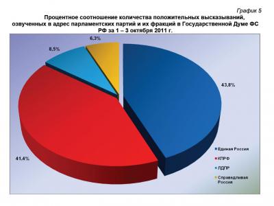 Итоговое процентное соотношение количества положительных высказываний, озвученных в адрес парламентских партий и их фракций в Государственной Думе за период 1 – 3 октября, составило: 43,8% от суммарного партийного ИИБ – за «Единой Россией», 41,4% - за КПРФ, 8,5% - за ЛДПР и 6,3% - за «Справедливой Россией» (график 5).