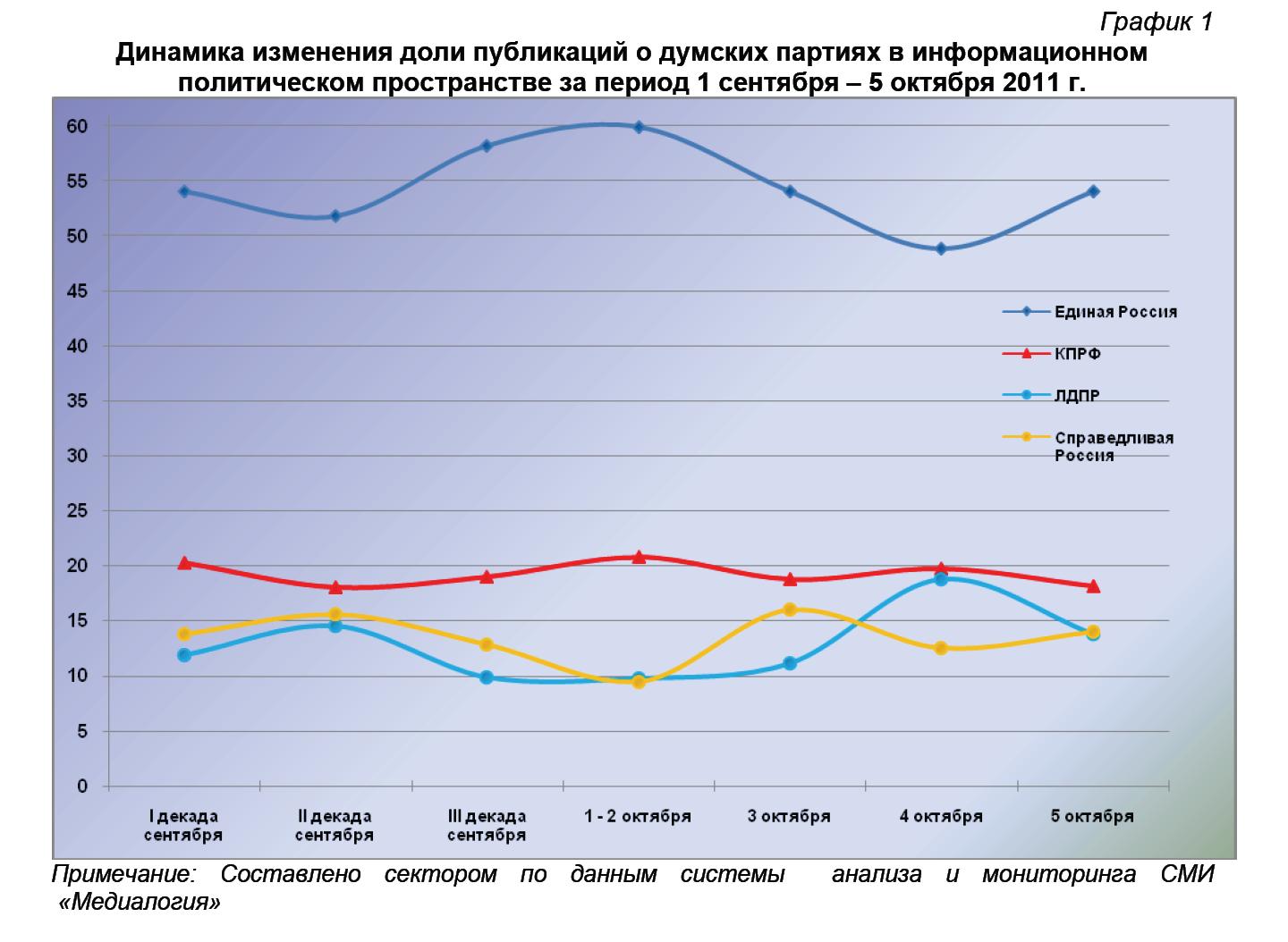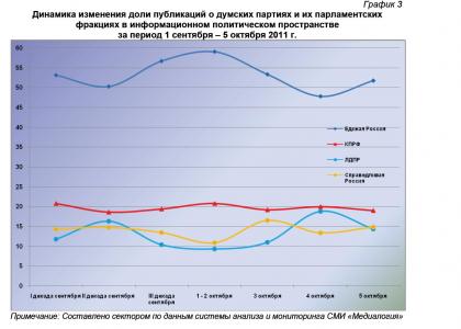 Динамический ряд, отражающий порядок наполнения медиа-потока публикациями о деятельности парламентских партий за период с 1 сентября по 5 октября 2011 г. (график 1), свидетельствует о достижении ими 5 октября средних за рассматриваемый временной отрезок показателей.