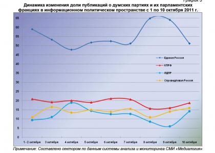 Анализ динамики доли публикаций о фракциях парламентских партий за 1 – 10 октября 2011 года (график 2) позволяет заключить, что на 10 октября пришёлся максимальный за рассматриваемый период процент упоминаний думских коммунистов и либерал-демократов, минимальный – единороссов при среднем показателе эсеров.