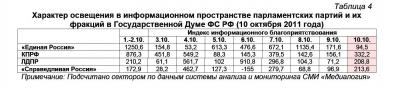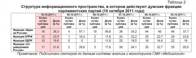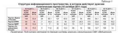 Контент-анализ публикаций СМИ с помощью системы «Медиалогия» позволил выявить следующую структуру информационного пространства, в котором действуют думские политические партии (таблица 1).