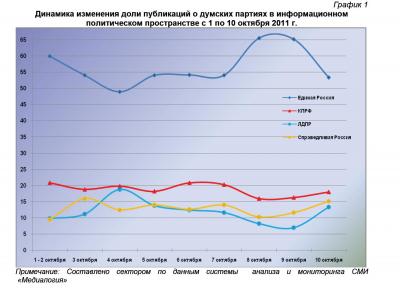 10 октября 2011 г. в информационном пространстве отмечалось 190 упоминаний о партии «Единая Россия» или 53,4% от общего числа высказываний, озвученных в адрес парламентских партий. В 64 материалах (18%) фигурировала КПРФ, в 54 (15,2%) – «Справедливая Россия», а в 48 (13,4%) – ЛДПР.