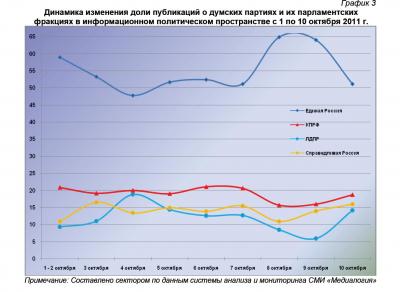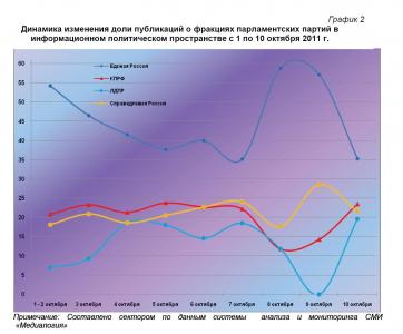 Анализ динамики доли публикаций о фракциях парламентских партий за 1 – 10 октября 2011 года (график 2) позволяет заключить, что на 10 октября пришёлся максимальный за рассматриваемый период процент упоминаний думских коммунистов и либерал-демократов, минимальный – единороссов при среднем показателе эсеров.