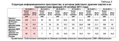 Обобщение результатов контент-анализа публикаций СМИ, приведённых в таблицах 1 и 2, позволил определить структуру информационного пространства, в котором действуют как думские партии, так и их парламентские фракции (таблица 3).