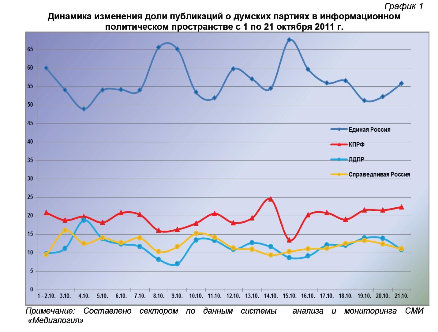 Динамический ряд, отражающий порядок наполнения медиа-потока публикациями о деятельности парламентских партий за период с 1 по 21 октября 2011 г. (график 1), позволяет заключить, что 21 октября показатели рассматриваемых политических сил, в целом, соответствовали среднемесячному уровню (с небольшим занижением значений – у эсеров и либерал-демократов и завышением – коммунистов).