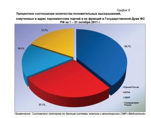 21 октября 2011 г. в информационном пространстве отмечалось 458 упоминаний о партии «Единая Россия» или 55,8% от общего числа высказываний, озвученных в адрес парламентских партий. В 184 материалах (22,4%) фигурировала КПРФ, в 90 (11%) – «Справедливая Россия», а в 89 (10,8%) – ЛДПР.