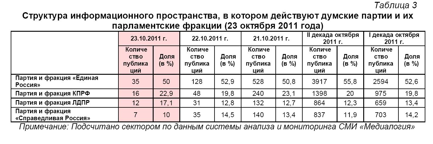 Контент-анализ публикаций СМИ с помощью системы «Медиалогия» позволил выявить следующую структуру информационного пространства, в котором действуют думские политические партии (таблица 1).