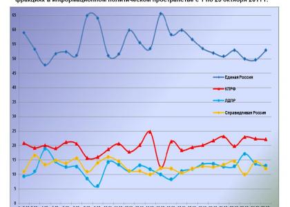 25 октября 2011 г. в информационном пространстве отмечалось 404 упоминания о партии «Единая Россия» или 54,8% от общего числа высказываний, озвученных в адрес парламентских партий. В 155 материалах (21%) фигурировала КПРФ, в 91 (12,3%) – ЛДПР, а в 88 (11,9%) – «Справедливая Россия».