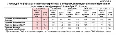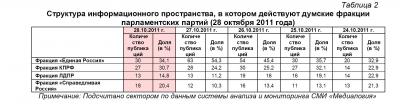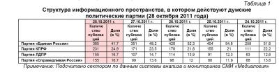 Контент-анализ публикаций СМИ с помощью системы «Медиалогия» позволил выявить следующую структуру информационного пространства, в котором действуют думские политические партии (таблица 1).