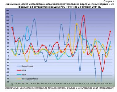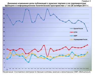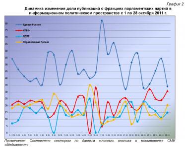 Анализ динамики доли публикаций о фракциях парламентских партий за 1 – 28 октября 2011 года (график 2) позволяет заключить, что на 28 октября пришёлся минимальный процент упоминаний в средствах массовой информации думских единороссов, максимальный – коммунистов, близкий к максимуму – эсеров при среднемесячном значении – либерал-демократов.
