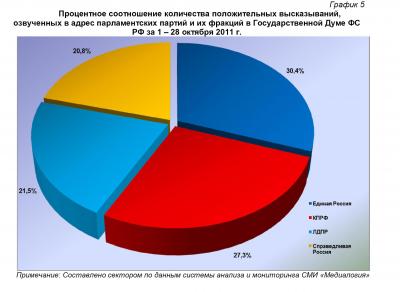28 октября 2011 г. в информационном пространстве отмечалось 385 упоминаний о партии «Единая Россия» или 41,7% от общего числа высказываний, озвученных в адрес парламентских партий. В 231 материале (24,9%) фигурировала КПРФ, а в 155 (16,7%) – ЛДПР и «Справедливая Россия».