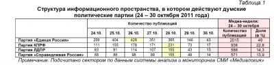 Контент-анализ публикаций СМИ с помощью системы «Медиалогия» позволил выявить следующую структуру информационного пространства, в котором действуют думские политические партии (таблица 1, график 1).